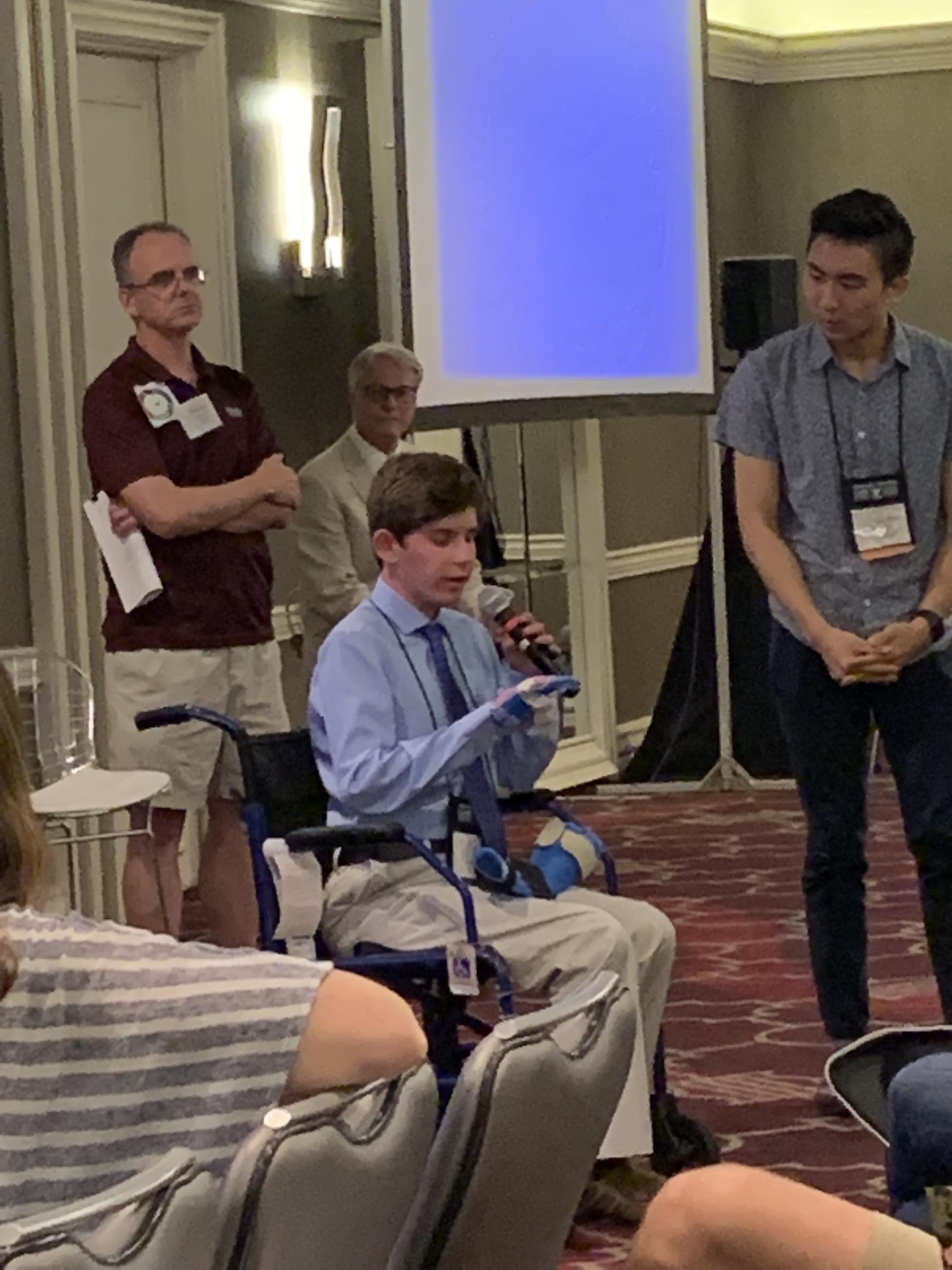 Co bylo zajímavé, to byla ukázka pacienta, který si sám vyrobil dlahy na prsty a na ruku. Ani v USA není dostupná pomůcka, která by pomohla s kontrakturami horních končetin. Téměř stejnou mi pro dceru letos vyrobila kamarádka fyzioterapeutka…