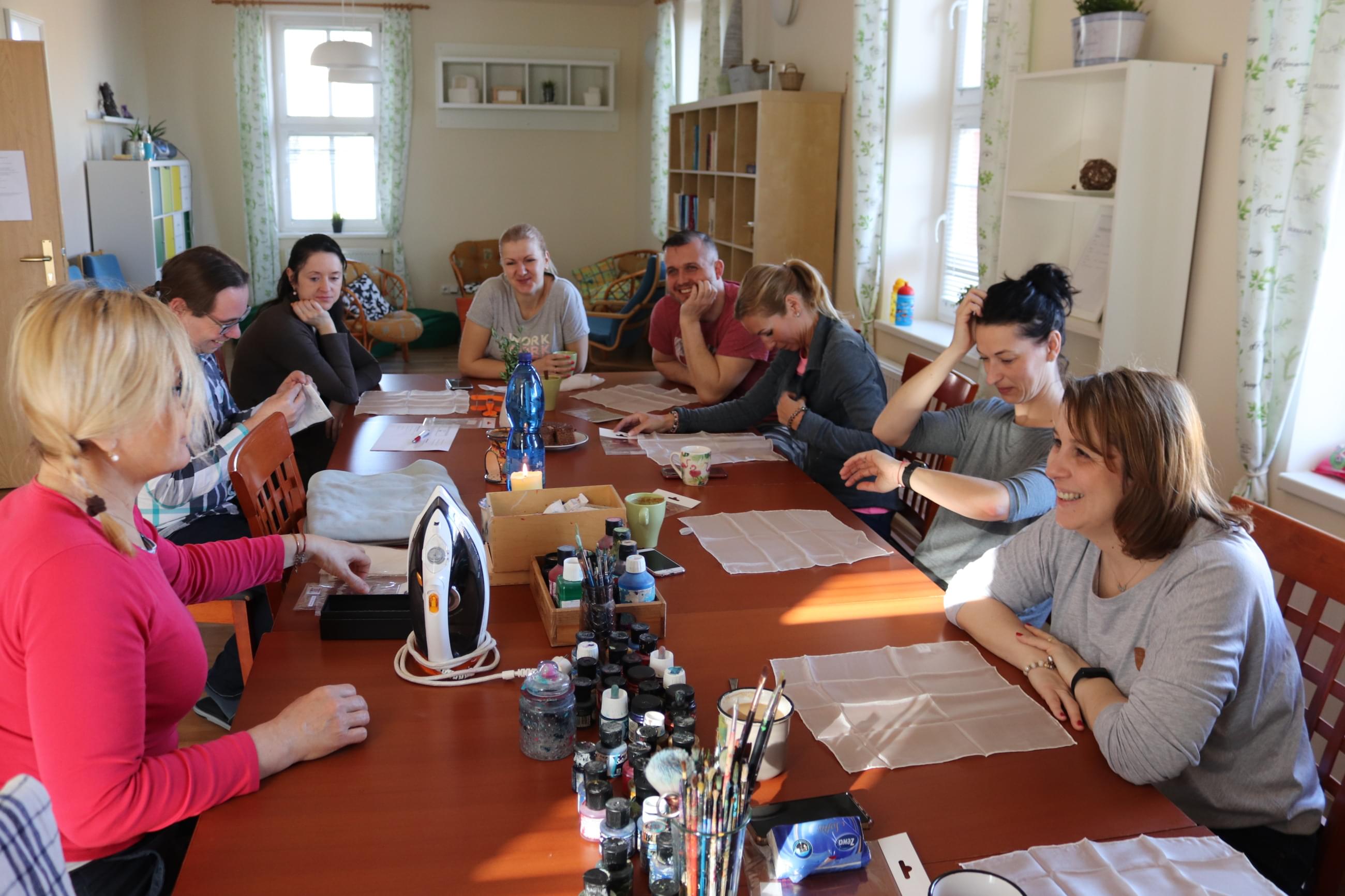 Neděli většinou trávíme tvořením. Tentokrát se ve velkém počtu zapojili i tatínci a v ničem si v malování hedvábných šátků nezadali s maminkami. Celým procesem malování nás provázela Marcela Poláková. Marcela je skvělá v tom, že v každém člověku vidí umělce a v každém výtvoru dílo hodné dražby nejprestižnějších aukčních síní. J A jak lépe oslavit Mezinárodní den žen, který na neděli připadl, než tím, že se všichni pochválíme. J