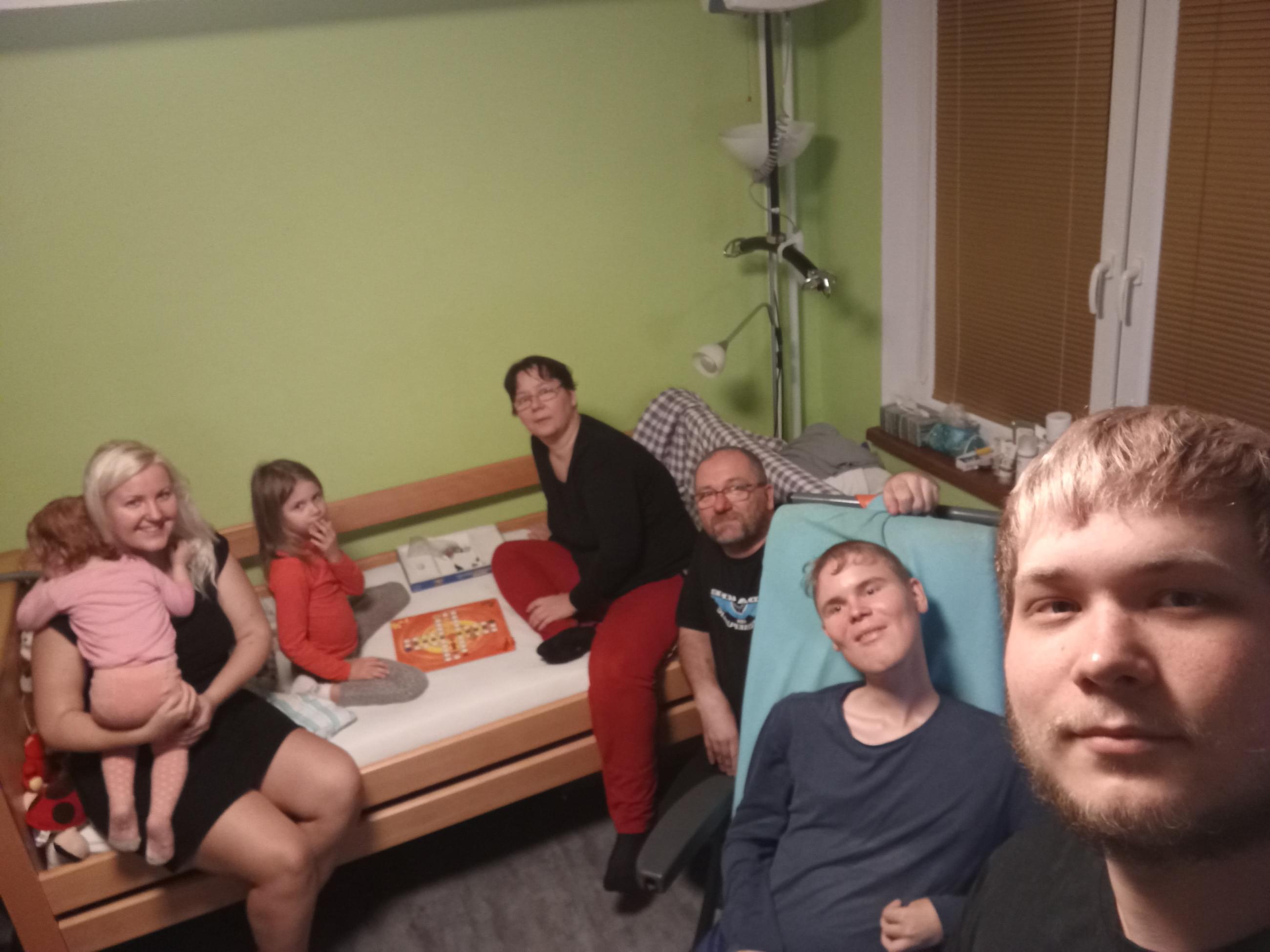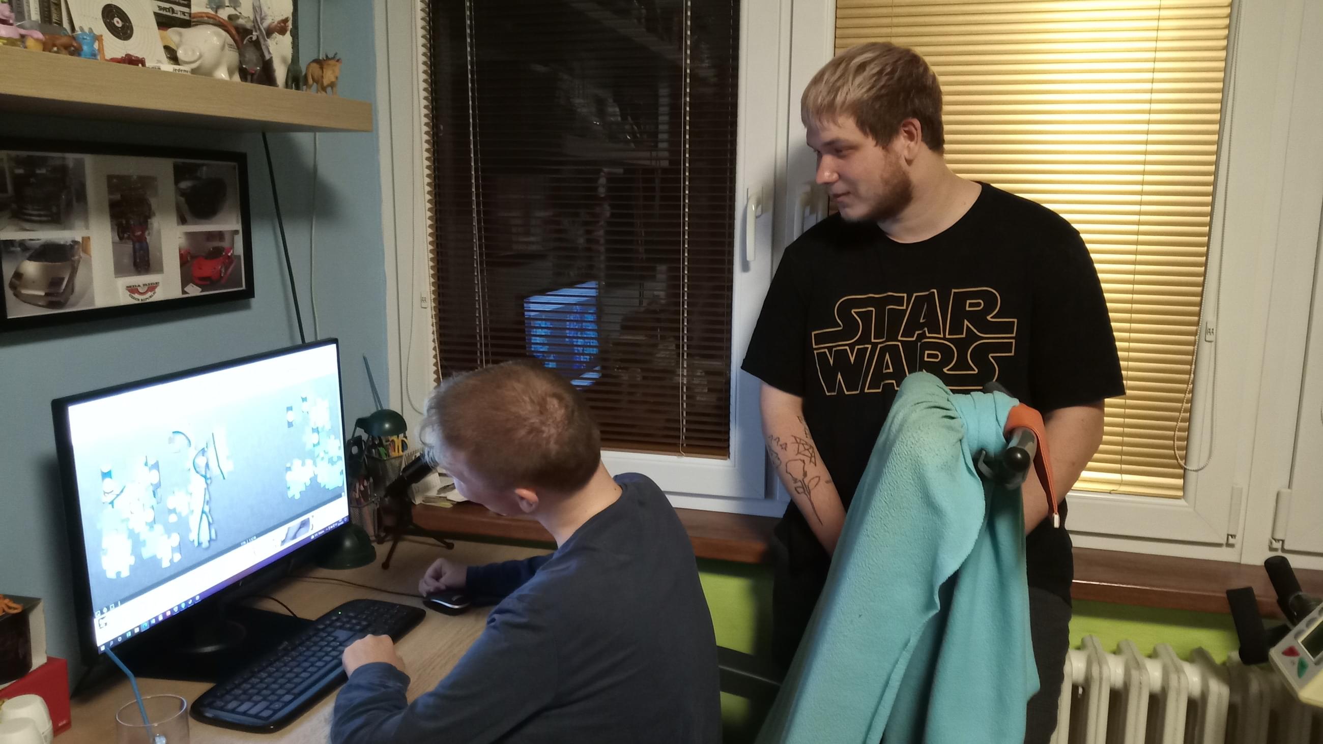 Oba míří do pokoje k Alešovu bratrovi Danielovi, který je s vozíkem přisunutý k počítači a hraje na dálku online hry s dalšími kluky z Parent Projectu.